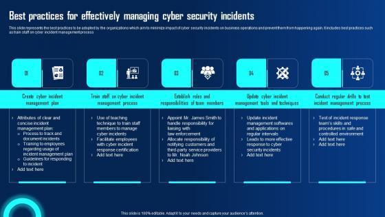 This slide represents the best practices to be adopted by the organizations which aim to minimize impact of cyber security incidents on business operations and prevent them from happening again. It includes best practices such as train staff on cyber incident management process If your project calls for a presentation, then Slidegeeks is your go to partner because we have professionally designed, easy to edit templates that are perfect for any presentation. After downloading, you can easily edit Best Practices For Effectively Managing Cyber Security Ppt Powerpoint Presentation File Model Pdf and make the changes accordingly. You can rearrange slides or fill them with different images. Check out all the handy templates This slide represents the best practices to be adopted by the organizations which aim to minimize impact of cyber security incidents on business operations and prevent them from happening again. It includes best practices such as train staff on cyber incident management process