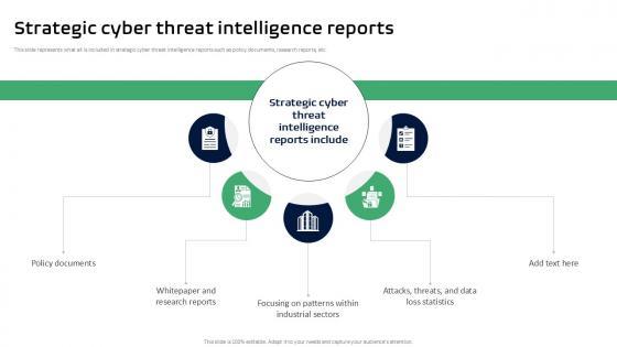 This slide represents what all is included in strategic cyber threat intelligence reports such as policy documents, research reports, etc. Are you searching for a Strategic Cyber Threat Intelligence Reports Threat Intelligence Ppt Template that is uncluttered, straightforward, and original Its easy to edit, and you can change the colors to suit your personal or business branding. For a presentation that expresses how much effort you have put in, this template is ideal With all of its features, including tables, diagrams, statistics, and lists, its perfect for a business plan presentation. Make your ideas more appealing with these professional slides. Download Strategic Cyber Threat Intelligence Reports Threat Intelligence Ppt Template from Slidegeeks today. This slide represents what all is included in strategic cyber threat intelligence reports such as policy documents, research reports, etc.