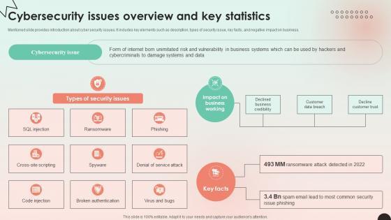 Mentioned slide provides introduction about cyber security issues. It includes key elements such as description, types of security issue, key facts, and negative impact on business. Coming up with a presentation necessitates that the majority of the effort goes into the content and the message you intend to convey. The visuals of a PowerPoint presentation can only be effective if it supplements and supports the story that is being told. Keeping this in mind our experts created Web Consulting Business Cybersecurity Issues Overview And Key Statistics to reduce the time that goes into designing the presentation. This way, you can concentrate on the message while our designers take care of providing you with the right template for the situation. Mentioned slide provides introduction about cyber security issues. It includes key elements such as description, types of security issue, key facts, and negative impact on business.