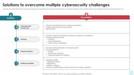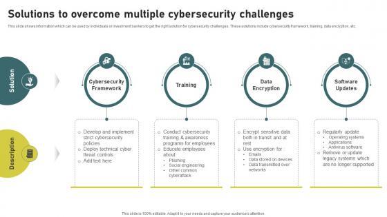 This slide shows information which can be used by individuals or investment bankers to get the right solution for cybersecurity challenges. These solutions include cybersecurity framework, training, data encryption, etc. Slidegeeks is here to make your presentations a breeze with Solutions To Overcome Multiple Cybersecurity Challenges Mastering Investment Banking Fin SS V With our easy-to-use and customizable templates, you can focus on delivering your ideas rather than worrying about formatting. With a variety of designs to choose from, you are sure to find one that suits your needs. And with animations and unique photos, illustrations, and fonts, you can make your presentation pop. So whether you are giving a sales pitch or presenting to the board, make sure to check out Slidegeeks first This slide shows information which can be used by individuals or investment bankers to get the right solution for cybersecurity challenges. These solutions include cybersecurity framework, training, data encryption, etc.