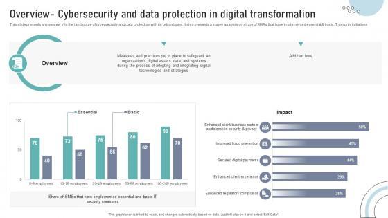 This slide presents an overview into the landscape of cybersecurity and data protection with its advantages. It also presents a survey analysis on share of SMEs that have implemented essential and basic IT security initiatives.Find highly impressive Overview Cybersecurity And Data Protection In Digital Transformation DT SS V on Slidegeeks to deliver a meaningful presentation. You can save an ample amount of time using these presentation templates. No need to worry to prepare everything from scratch because Slidegeeks experts have already done a huge research and work for you. You need to download Overview Cybersecurity And Data Protection In Digital Transformation DT SS V for your upcoming presentation. All the presentation templates are 100 percent editable and you can change the color and personalize the content accordingly. Download now This slide presents an overview into the landscape of cybersecurity and data protection with its advantages. It also presents a survey analysis on share of SMEs that have implemented essential and basic IT security initiatives.