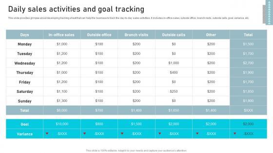 This slide provides glimpse about developing tracking sheet that can help the business to track the day-to-day sales activities. It includes in-office sales, outside office, branch visits, outside calls, goal, variance, etc. If your project calls for a presentation, then Slidegeeks is your go to partner because we have professionally designed, easy to edit templates that are perfect for any presentation. After downloading, you can easily edit Daily Sales Activities And Goal Tracking Developing Extensive Sales And Operations Strategy Elements Pdf and make the changes accordingly. You can rearrange slides or fill them with different images. Check out all the handy templates. This slide provides glimpse about developing tracking sheet that can help the business to track the day-to-day sales activities. It includes in-office sales, outside office, branch visits, outside calls, goal, variance, etc.