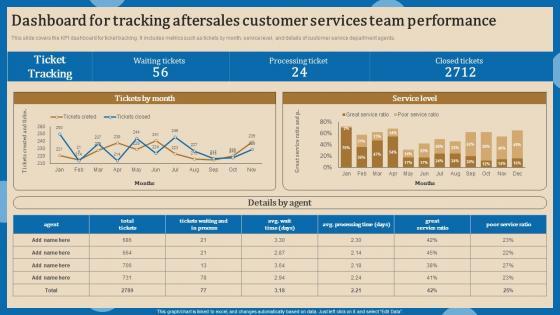 This slide covers the KPI dashboard for ticket tracking. It includes metrics such as tickets by month, service level, and details of customer service department agents. If your project calls for a presentation, then Slidegeeks is your go to partner because we have professionally designed, easy to edit templates that are perfect for any presentation. After downloading, you can easily edit Ultimate Guide To Improve Customer Support And Services Dashboard For Tracking Aftersales Customer Sample PDF and make the changes accordingly. You can rearrange slides or fill them with different images. Check out all the handy templates