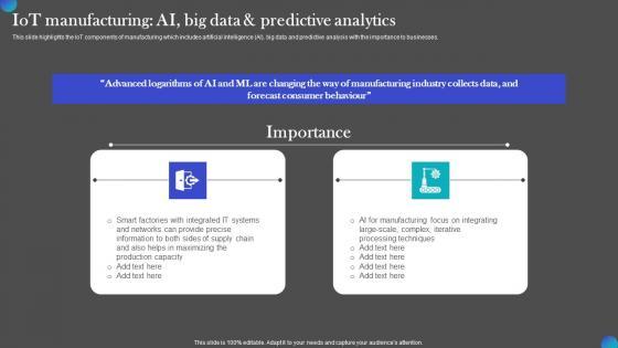 This slide highlights the IoT components of manufacturing which includes artificial intelligence AI, big data and predictive analysis with the importance to businesses. This IOT Manufacturing AI Big Data And Predictive IOT Adoption Manufacturing Structure PDF is perfect for any presentation, be it in front of clients or colleagues. It is a versatile and stylish solution for organizing your meetings. The IOT Manufacturing AI Big Data And Predictive IOT Adoption Manufacturing Structure PDF features a modern design for your presentation meetings. The adjustable and customizable slides provide unlimited possibilities for acing up your presentation. Slidegeeks has done all the homework before launching the product for you. So, do not wait, grab the presentation templates today This slide highlights the IoT components of manufacturing which includes artificial intelligence AI, big data and predictive analysis with the importance to businesses.