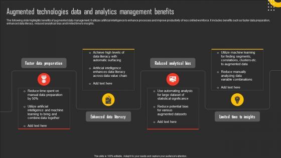 The following slide highlights benefits of augmented data management. It utilizes artificial intelligence to enhance processes and improve productivity of less skilled workforce. It includes benefits such as faster data preparation, enhanced data literacy, reduced analytical bias and limited time to insights. Showcasing this set of slides titled Augmented Technologies Data And Analytics Management Benefits Guidelines Pdf. The topics addressed in these templates are Faster Data Preparation, Enhanced Data Literacy, Reduced Analytical Bias. All the content presented in this PPT design is completely editable. Download it and make adjustments in color, background, font etc. as per your unique business setting. The following slide highlights benefits of augmented data management. It utilizes artificial intelligence to enhance processes and improve productivity of less skilled workforce. It includes benefits such as faster data preparation, enhanced data literacy, reduced analytical bias and limited time to insights.