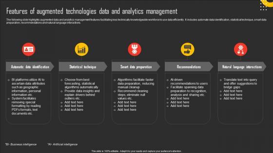 The following slide highlights augmented data and analytics management features facilitating less technically knowledgeable workforce to use data efficiently. It includes automate data identification, statistical technique, smart data preparation, recommendations and natural language interactions. Pitch your topic with ease and precision using this Features Of Augmented Technologies Data And Analytics Management Introduction Pdf. This layout presents information on Statistical Technique, Smart Data Preparation, Recommendations. It is also available for immediate download and adjustment. So, changes can be made in the color, design, graphics or any other component to create a unique layout. The following slide highlights augmented data and analytics management features facilitating less technically knowledgeable workforce to use data efficiently. It includes automate data identification, statistical technique, smart data preparation, recommendations and natural language interactions.
