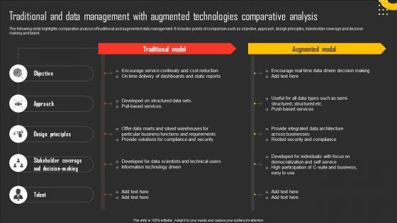The following slide highlights comparative analysis of traditional and augmented data management. It includes points of comparison such as objective, approach, design principles, stakeholder coverage and decision making and talent. Pitch your topic with ease and precision using this Traditional And Data Management With Augmented Technologies Comparative Analysis Professional Pdf. This layout presents information on Objective, Approach, Design Principles. It is also available for immediate download and adjustment. So, changes can be made in the color, design, graphics or any other component to create a unique layout. The following slide highlights comparative analysis of traditional and augmented data management. It includes points of comparison such as objective, approach, design principles, stakeholder coverage and decision making and talent.