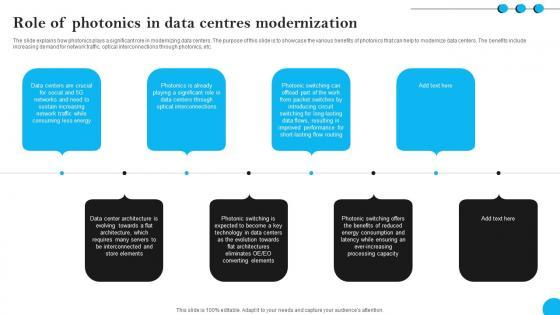 The slide explains how photonics plays a significant role in modernizing data centers. The purpose of this slide is to showcase the various benefits of photonics that can help to modernize data centers. The benefits include increasing demand for network traffic, optical interconnections through photonics, etc. Find highly impressive Fibers IT Role Of Photonics In Data Centres Modernization on Slidegeeks to deliver a meaningful presentation. You can save an ample amount of time using these presentation templates. No need to worry to prepare everything from scratch because Slidegeeks experts have already done a huge research and work for you. You need to download Fibers IT Role Of Photonics In Data Centres Modernization for your upcoming presentation. All the presentation templates are 100 percent editable and you can change the color and personalize the content accordingly. Download now The slide explains how photonics plays a significant role in modernizing data centers. The purpose of this slide is to showcase the various benefits of photonics that can help to modernize data centers. The benefits include increasing demand for network traffic, optical interconnections through photonics, etc.