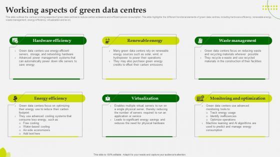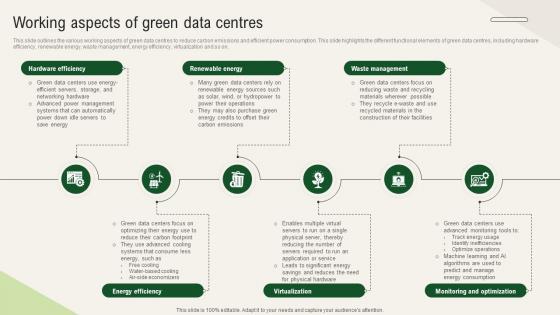 This slide outlines the various working aspects of green data centres to reduce carbon emissions and efficient power consumption. This slide highlights the different functional elements of green data centres, including hardware efficiency, renewable energy, waste management, energy efficiency, virtualization and so on. Crafting an eye-catching presentation has never been more straightforward. Let your presentation shine with this tasteful yet straightforward Sustainable Working Aspects Of Green Data Centres template. It offers a minimalistic and classy look that is great for making a statement. The colors have been employed intelligently to add a bit of playfulness while still remaining professional. Construct the ideal Sustainable Working Aspects Of Green Data Centres that effortlessly grabs the attention of your audience Begin now and be certain to wow your customers This slide outlines the various working aspects of green data centres to reduce carbon emissions and efficient power consumption. This slide highlights the different functional elements of green data centres, including hardware efficiency, renewable energy, waste management, energy efficiency, virtualization and so on.