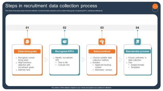 This slide showcases steps involved in effective recruitment data collection such as determining goals, recognizing KPIs, selecting methods etc. Do you have to make sure that everyone on your team knows about any specific topic I yes, then you should give Strategic Staffing Using Data Steps In Recruitment Data Collection Process CRP DK SS V a try. Our experts have put a lot of knowledge and effort into creating this impeccable Strategic Staffing Using Data Steps In Recruitment Data Collection Process CRP DK SS V. You can use this template for your upcoming presentations, as the slides are perfect to represent even the tiniest detail. You can download these templates from the Slidegeeks website and these are easy to edit. So grab these today This slide showcases steps involved in effective recruitment data collection such as determining goals, recognizing KPIs, selecting methods etc.