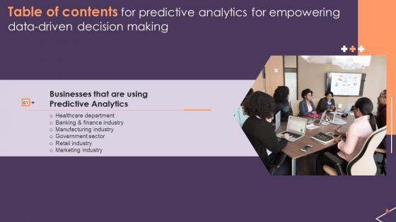 This Table Of Contents For Predictive Analytics For Empowering Data Driven Decision Making Formats Pdf is perfect for any presentation, be it in front of clients or colleagues. It is a versatile and stylish solution for organizing your meetings. The Table Of Contents For Predictive Analytics For Empowering Data Driven Decision Making Formats Pdf features a modern design for your presentation meetings. The adjustable and customizable slides provide unlimited possibilities for acing up your presentation. Slidegeeks has done all the homework before launching the product for you. So, do not wait, grab the presentation templates today Our Table Of Contents For Predictive Analytics For Empowering Data Driven Decision Making Formats Pdf are topically designed to provide an attractive backdrop to any subject. Use them to look like a presentation pro.