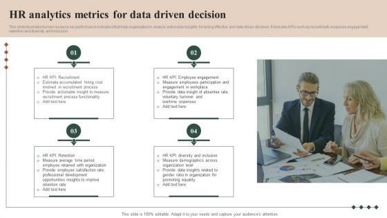 This slide illustrates human resource key performance indicators that help organization to analyze actionable insights for taking effective and date driven decision. It includes KPIs such as recruitment, employee engagement, retention and diversity and inclusion.Pitch your topic with ease and precision using this HR Analytics Metrics For Data Driven Decision Summary Pdf This layout presents information on Estimate Accumulated, Involved Recruitment, Provide Actionable Insight It is also available for immediate download and adjustment. So, changes can be made in the color, design, graphics or any other component to create a unique layout. This slide illustrates human resource key performance indicators that help organization to analyze actionable insights for taking effective and date driven decision. It includes KPIs such as recruitment, employee engagement, retention and diversity and inclusion.