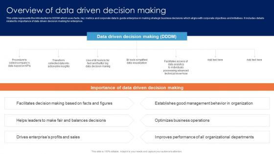 This slide represents the introduction to DDDM which uses facts, key metrics and corporate data to guide enterprise in making strategic business decisions which aligns with corporate objectives and initiatives. It includes details related to importance of data driven decision making for enterprise. This Overview Of Data Driven Decision Making Microsoft PDF is perfect for any presentation, be it in front of clients or colleagues. It is a versatile and stylish solution for organizing your meetings. The Overview Of Data Driven Decision Making Microsoft PDF features a modern design for your presentation meetings. The adjustable and customizable slides provide unlimited possibilities for acing up your presentation. Slidegeeks has done all the homework before launching the product for you. So, do not wait, grab the presentation templates today