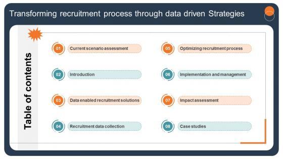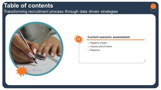 Want to ace your presentation in front of a live audience Our Table Of Contents Transforming Recruitment Process Through Data Driven Strategies CRP DK SS can help you do that by engaging all the users towards you. Slidegeeks experts have put their efforts and expertise into creating these impeccable powerpoint presentations so that you can communicate your ideas clearly. Moreover, all the templates are customizable, and easy-to-edit and downloadable. Use these for both personal and commercial use. Our Table Of Contents Transforming Recruitment Process Through Data Driven Strategies CRP DK SS are topically designed to provide an attractive backdrop to any subject. Use them to look like a presentation pro.