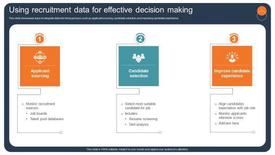 This slide showcases ways to integrate data into hiring process such as applicant sourcing, candidate selection and improving candidate experience. Do you have an important presentation coming up Are you looking for something that will make your presentation stand out from the rest Look no further than Strategic Staffing Using Data Using Recruitment Data For Effective Decision Making CRP DK SS V. With our professional designs, you can trust that your presentation will pop and make delivering it a smooth process. And with Slidegeeks, you can trust that your presentation will be unique and memorable. So why wait Grab Strategic Staffing Using Data Using Recruitment Data For Effective Decision Making CRP DK SS V today and make your presentation stand out from the rest This slide showcases ways to integrate data into hiring process such as applicant sourcing, candidate selection and improving candidate experience.