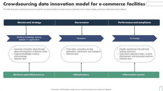 This slide showcases crowdsourcing innovation model for e-commerce facilities. It includes various components such as mission, strategy, governance, performance and compliance. Showcasing this set of slides titled Crowdsourcing Data Innovation Model For E Commerce Facilities Graphics Pdf The topics addressed in these templates are Mission And Strategy, Governance, Performance And Compliance All the content presented in this PPT design is completely editable. Download it and make adjustments in color, background, font etc. as per your unique business setting. This slide showcases crowdsourcing innovation model for e-commerce facilities. It includes various components such as mission, strategy, governance, performance and compliance.