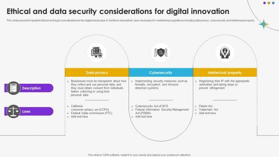 This slide presents important ethical and legal considerations in the digital landscape. It mentions description, laws necessary for maintaining regulations including data privacy, cybersecurity and intellectual property.Find a pre-designed and impeccable Ethical And Data Security Considerations For Digital Innovation DT SS V. The templates can ace your presentation without additional effort. You can download these easy-to-edit presentation templates to make your presentation stand out from others. So, what are you waiting for Download the template from Slidegeeks today and give a unique touch to your presentation. This slide presents important ethical and legal considerations in the digital landscape. It mentions description, laws necessary for maintaining regulations including data privacy, cybersecurity and intellectual property.