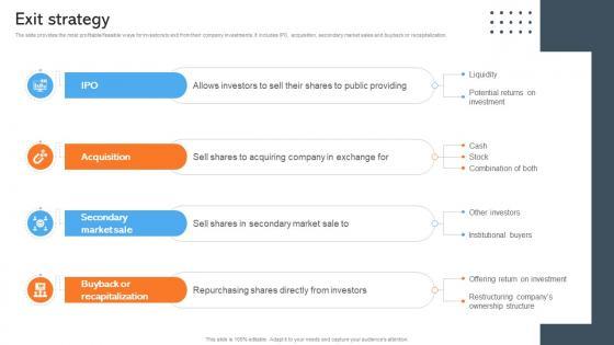 The slide provides the most profitable or feasible ways for investors to exit from their company investments. It includes IPO, acquisition, secondary market sales and buyback or recapitalization. From laying roadmaps to briefing everything in detail, our templates are perfect for you. You can set the stage with your presentation slides. All you have to do is download these easy-to-edit and customizable templates. Exit Strategy Data Management Company Investor Funding Pitch Deck will help you deliver an outstanding performance that everyone would remember and praise you for. Do download this presentation today. The slide provides the most profitable or feasible ways for investors to exit from their company investments. It includes IPO, acquisition, secondary market sales and buyback or recapitalization.