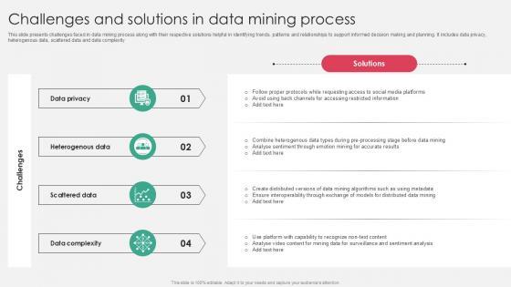 This slide presents challenges faced in data mining process along with their respective solutions helpful in identifying trends, patterns and relationships to support informed decision making and planning. It includes data privacy, heterogenous data, scattered data and data complexity. Boost your pitch with our creative Challenges And Solutions In Data Mining Process PPT Slides SS. Deliver an awe-inspiring pitch that will mesmerize everyone. Using these presentation templates you will surely catch everyones attention. You can browse the ppts collection on our website. We have researchers who are experts at creating the right content for the templates. So you do not have to invest time in any additional work. Just grab the template now and use them. This slide presents challenges faced in data mining process along with their respective solutions helpful in identifying trends, patterns and relationships to support informed decision making and planning. It includes data privacy, heterogenous data, scattered data and data complexity