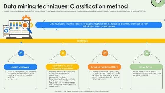 This slide showcases classification method of data mining technique to help data experts perform comparative analysis of multiple datasets. It provides details about logistics regression, decision trees, K-nearest neighbors KNN , etc. Find highly impressive Data Mining Techniques Classification Method Data Warehousing And Data Mining Guide AI SS V on Slidegeeks to deliver a meaningful presentation. You can save an ample amount of time using these presentation templates. No need to worry to prepare everything from scratch because Slidegeeks experts have already done a huge research and work for you. You need to download Data Mining Techniques Classification Method Data Warehousing And Data Mining Guide AI SS V for your upcoming presentation. All the presentation templates are 100 percent editable and you can change the color and personalize the content accordingly. Download now This slide showcases classification method of data mining technique to help data experts perform comparative analysis of multiple datasets. It provides details about logistics regression, decision trees, K-nearest neighbors KNN , etc.