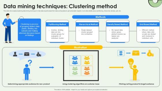 This slide showcases clustering data mining technique to help data experts ease their data sorting tasks to get actionable insights. It provides details about partitioning, hierarchal, density, grid, etc. Are you searching for a Data Mining Techniques Clustering Method Using Data Mining Tools To Optimize Processes AI SS V that is uncluttered, straightforward, and original Its easy to edit, and you can change the colors to suit your personal or business branding. For a presentation that expresses how much effort you have put in, this template is ideal With all of its features, including tables, diagrams, statistics, and lists, its perfect for a business plan presentation. Make your ideas more appealing with these professional slides. Download Data Mining Techniques Clustering Method Using Data Mining Tools To Optimize Processes AI SS V from Slidegeeks today. This slide showcases clustering data mining technique to help data experts ease their data sorting tasks to get actionable insights. It provides details about partitioning, hierarchal, density, grid, etc.