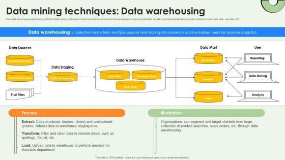 This slide showcases warehousing method of data mining technique to help businesses store and perform analysis for improving desirable results. It provides details about extract, transform, load, meta data, raw data, etc. Retrieve professionally designed Data Mining Techniques Data Warehousing Using Data Mining Tools To Optimize Processes AI SS V to effectively convey your message and captivate your listeners. Save time by selecting pre-made slideshows that are appropriate for various topics, from business to educational purposes. These themes come in many different styles, from creative to corporate, and all of them are easily adjustable and can be edited quickly. Access them as PowerPoint templates or as Google Slides themes. You do not have to go on a hunt for the perfect presentation because Slidegeeks got you covered from everywhere. This slide showcases warehousing method of data mining technique to help businesses store and perform analysis for improving desirable results. It provides details about extract, transform, load, meta data, raw data, etc.