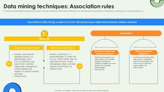 This slide showcases association rules data mining technique to help data experts find correlations between data points. It provides details about single-dimensional, multi-dimensional, shopping behavior, purchase suggestion, etc. Explore a selection of the finest Data Mining Techniques Association Rules Using Data Mining Tools To Optimize Processes AI SS V here. With a plethora of professionally designed and pre-made slide templates, you can quickly and easily find the right one for your upcoming presentation. You can use our Data Mining Techniques Association Rules Using Data Mining Tools To Optimize Processes AI SS V to effectively convey your message to a wider audience. Slidegeeks has done a lot of research before preparing these presentation templates. The content can be personalized and the slides are highly editable. Grab templates today from Slidegeeks. This slide showcases association rules data mining technique to help data experts find correlations between data points. It provides details about single-dimensional, multi-dimensional, shopping behavior, purchase suggestion, etc.