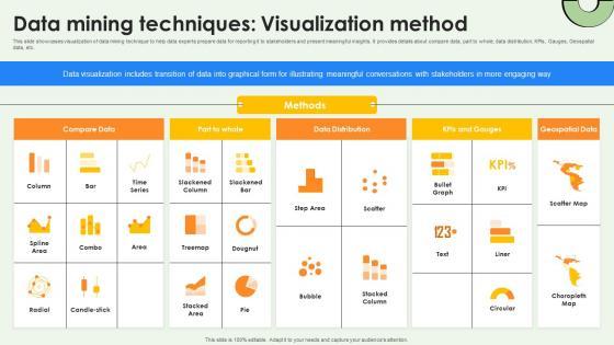 This slide showcases visualization of data mining technique to help data experts prepare data for reporting it to stakeholders and present meaningful insights. It provides details about compare data, part to whole, data distribution, KPIs, Gauges, Geospatial data, etc. Find a pre-designed and impeccable Data Warehousing And Data Mining Techniques Visualization Method AI SS V. The templates can ace your presentation without additional effort. You can download these easy-to-edit presentation templates to make your presentation stand out from others. So, what are you waiting for Download the template from Slidegeeks today and give a unique touch to your presentation. This slide showcases visualization of data mining technique to help data experts prepare data for reporting it to stakeholders and present meaningful insights. It provides details about compare data, part to whole, data distribution, KPIs, Gauges, Geospatial data, etc.