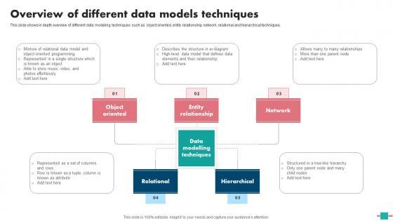 This slide shows in depth overview of different data modeling techniques such as object oriented, entity relationship, network, relational and hierarchical techniques. Do you know about Slidesgeeks Database Modeling Structures Overview Of Different Data Modeling Techniques Template Pdf These are perfect for delivering any kind od presentation. Using it, create PowerPoint presentations that communicate your ideas and engage audiences. Save time and effort by using our pre-designed presentation templates that are perfect for a wide range of topic. Our vast selection of designs covers a range of styles, from creative to business, and are all highly customizable and easy to edit. Download as a PowerPoint template or use them as Google Slides themes. This slide shows in depth overview of different data modeling techniques such as object oriented, entity relationship, network, relational and hierarchical techniques.