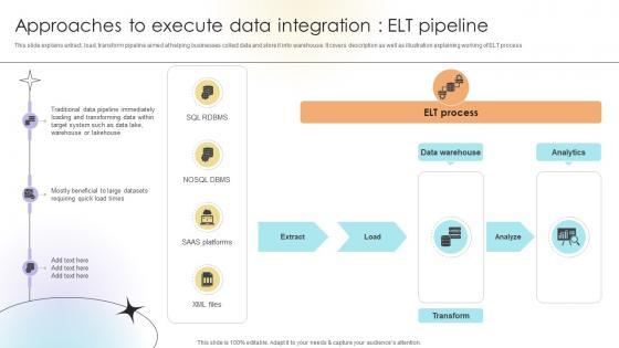 This slide explains extract, load, transform pipeline aimed at helping businesses collect data and store it into warehouse. It covers description as well as illustration explaining working of ELT process.Are you in need of a template that can accommodate all of your creative concepts This one is crafted professionally and can be altered to fit any style. Use it with Google Slides or PowerPoint. Include striking photographs, symbols, depictions, and other visuals. Fill, move around, or remove text boxes as desired. Test out color palettes and font mixtures. Edit and save your work, or work with colleagues. Download Approaches To Execute Data Integration ELT Pipeline Data Analytics SS V and observe how to make your presentation outstanding. Give an impeccable presentation to your group and make your presentation unforgettable. This slide explains extract, load, transform pipeline aimed at helping businesses collect data and store it into warehouse. It covers description as well as illustration explaining working of ELT process.