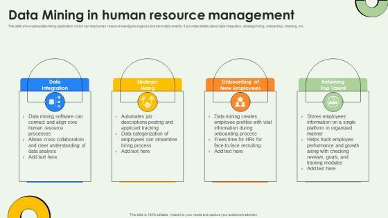 This slide showcases data mining application which can help human resource managers organize and store data smartly. It provides details about data integration, strategic hiring, onboarding, retaining, etc. This Data Warehousing And Data Mining In Human Resource Management AI SS V from Slidegeeks makes it easy to present information on your topic with precision. It provides customization options, so you can make changes to the colors, design, graphics, or any other component to create a unique layout. It is also available for immediate download, so you can begin using it right away. Slidegeeks has done good research to ensure that you have everything you need to make your presentation stand out. Make a name out there for a brilliant performance. This slide showcases data mining application which can help human resource managers organize and store data smartly. It provides details about data integration, strategic hiring, onboarding, retaining, etc.