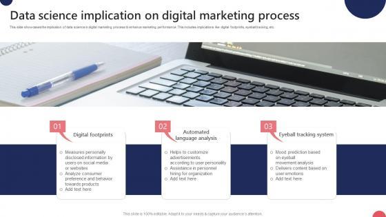 This slide showcases the implication of data science in digital marketing process to enhance marketing performance. This includes implications like digital footprints, eyeball tracking, etc. Showcasing this set of slides titled Data Science Implication On Digital Marketing Process Ppt Infographics Smartart Pdf. The topics addressed in these templates are Digital Footprints, Eyeball Tracking, Automated Language Analysis. All the content presented in this PPT design is completely editable. Download it and make adjustments in color, background, font etc. as per your unique business setting. This slide showcases the implication of data science in digital marketing process to enhance marketing performance. This includes implications like digital footprints, eyeball tracking, etc.