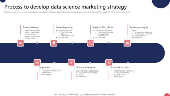 This slide showcases the process to develop data science strategy for marketing analysis. This includes various steps like assemble team, data integration, analyze ROI criteria, audience analysis, etc. Pitch your topic with ease and precision using this Process To Develop Data Science Marketing Strategy Ppt Portfolio Format Pdf. This layout presents information on Assemble Team, Data Integration, Analyze ROI Criteria. It is also available for immediate download and adjustment. So, changes can be made in the color, design, graphics or any other component to create a unique layout. This slide showcases the process to develop data science strategy for marketing analysis. This includes various steps like assemble team, data integration, analyze ROI criteria, audience analysis, etc.