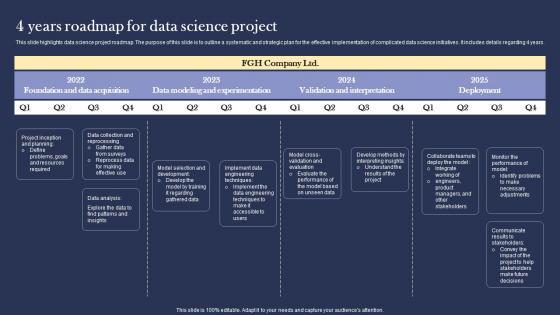 This slide highlights data science project roadmap. The purpose of this slide is to outline a systematic and strategic plan for the effective implementation of complicated data science initiatives. It includes details regarding 4 years. Showcasing this set of slides titled 4 Years Roadmap For Data Science Project Structure pdf. The topics addressed in these templates are Project Inception, Data Collection, Data Analysis. All the content presented in this PPT design is completely editable. Download it and make adjustments in color, background, font etc. as per your unique business setting. This slide highlights data science project roadmap. The purpose of this slide is to outline a systematic and strategic plan for the effective implementation of complicated data science initiatives. It includes details regarding 4 years.