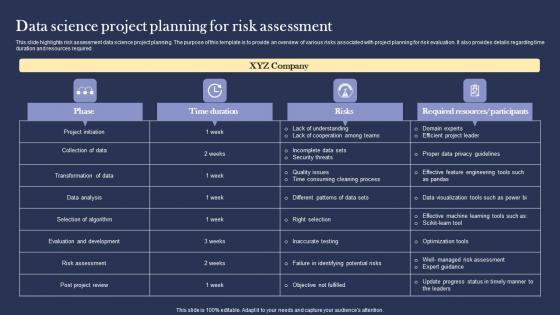 This slide highlights risk assessment data science project planning. The purpose of this template is to provide an overview of various risks associated with project planning for risk evaluation. It also provides details regarding time duration and resources required. Showcasing this set of slides titled Data Science Project Planning For Risk Assessment Slides pdf. The topics addressed in these templates are Project Initiation, Time Duration, Risks. All the content presented in this PPT design is completely editable. Download it and make adjustments in color, background, font etc. as per your unique business setting. This slide highlights risk assessment data science project planning. The purpose of this template is to provide an overview of various risks associated with project planning for risk evaluation. It also provides details regarding time duration and resources required.