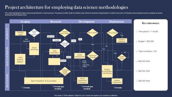 This slide highlights the data science project flow for a new business. The purpose of this slide is to define roles of teams involved in deploying the model to end users. It includes various phases such as scoping, research, development and deployment. Showcasing this set of slides titled Project Architecture For Employing Data Science Methodologies Topics pdf. The topics addressed in these templates are Scoping, Research, Development And Deployment. All the content presented in this PPT design is completely editable. Download it and make adjustments in color, background, font etc. as per your unique business setting. This slide highlights the data science project flow for a new business. The purpose of this slide is to define roles of teams involved in deploying the model to end users. It includes various phases such as scoping, research, development and deployment.