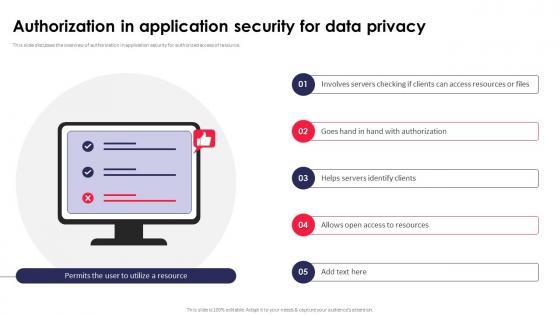 This slide discusses the overview of authorization in application security for authorized access of resource. Slidegeeks is here to make your presentations a breeze with Authorization In Application Security For Data Privacy Application Security Testing With our easy-to-use and customizable templates, you can focus on delivering your ideas rather than worrying about formatting. With a variety of designs to choose from, you are sure to find one that suits your needs. And with animations and unique photos, illustrations, and fonts, you can make your presentation pop. So whether you are giving a sales pitch or presenting to the board, make sure to check out Slidegeeks first This slide discusses the overview of authorization in application security for authorized access of resource.