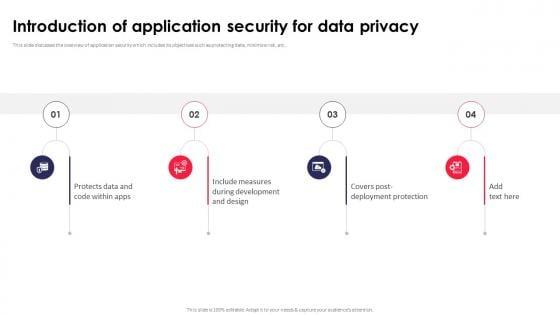 This slide discusses the overview of application security which includes its objectives such as protecting data, minimize risk, etc. Explore a selection of the finest Introduction Of Application Security For Data Privacy Application Security Testing here. With a plethora of professionally designed and pre-made slide templates, you can quickly and easily find the right one for your upcoming presentation. You can use our Introduction Of Application Security For Data Privacy Application Security Testing to effectively convey your message to a wider audience. Slidegeeks has done a lot of research before preparing these presentation templates. The content can be personalized and the slides are highly editable. Grab templates today from Slidegeeks. This slide discusses the overview of application security which includes its objectives such as protecting data, minimize risk, etc.