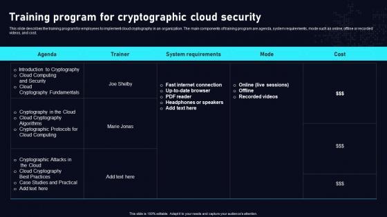 This slide describes the training program for employees to implement cloud cryptography in an organization. The main components of training program are agenda, system requirements, mode such as online, offline or recorded videos, and cost. Whether you have daily or monthly meetings, a brilliant presentation is necessary. Training Program For Cryptographic Data Security In Cloud Computing Ppt Powerpoint can be your best option for delivering a presentation. Represent everything in detail using Training Program For Cryptographic Data Security In Cloud Computing Ppt Powerpoint and make yourself stand out in meetings. The template is versatile and follows a structure that will cater to your requirements. All the templates prepared by Slidegeeks are easy to download and edit. Our research experts have taken care of the corporate themes as well. So, give it a try and see the results. This slide describes the training program for employees to implement cloud cryptography in an organization. The main components of training program are agenda, system requirements, mode such as online, offline or recorded videos, and cost.