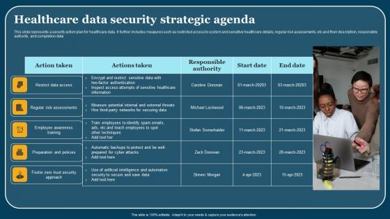 This slide represents a security action plan for healthcare data. It further includes measures such as restricted access to system and sensitive healthcare details, regular risk assessments, etc and their description, responsible authority, and completion date. Showcasing this set of slides titled Healthcare Data Security Strategic Agenda Themes Pdf. The topics addressed in these templates are Employee Awareness Training, Action Taken. All the content presented in this PPT design is completely editable. Download it and make adjustments in color, background, font etc. as per your unique business setting. This slide represents a security action plan for healthcare data. It further includes measures such as restricted access to system and sensitive healthcare details, regular risk assessments, etc and their description, responsible authority, and completion date.