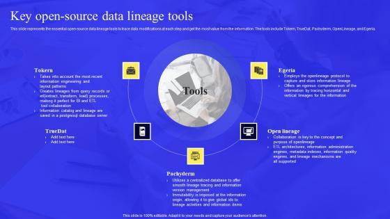 This slide represents the essential open-source data lineage tools to trace data modifications at each step and get the most value from the information. The tools include Tokern, TrueDat, Pachyderm, OpenLineage, and Egeria. Find a pre designed and impeccable Data Lineage Implementation Key Open Source Data Lineage Tools Download PDF. The templates can ace your presentation without additional effort. You can download these easy to edit presentation templates to make your presentation stand out from others. So, what are you waiting for Download the template from Slidegeeks today and give a unique touch to your presentation.