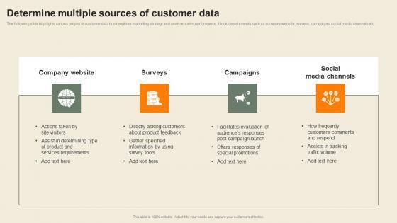 The following slide highlights various origins of customer data to strengthen marketing strategy and analyze sales performance. It includes elements such as company website, surveys, campaigns, social media channels etc. Welcome to our selection of the Determine Multiple Sources Of Customer Data Usability Of CDP Software Tool Summary Pdf. These are designed to help you showcase your creativity and bring your sphere to life. Planning and Innovation are essential for any business that is just starting out. This collection contains the designs that you need for your everyday presentations. All of our PowerPoints are 100 percent editable, so you can customize them to suit your needs. This multi-purpose template can be used in various situations. Grab these presentation templates today The following slide highlights various origins of customer data to strengthen marketing strategy and analyze sales performance. It includes elements such as company website, surveys, campaigns, social media channels etc.