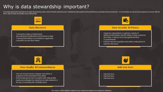 This slide depicts the importance of a data stewardship system, and it includes data discovery, maintaining data quality and trustworthiness, and data security and privacy. It is essential to any governance programs success without them, data security and quality issues will persist. Slidegeeks has constructed Why Is Data Stewardship Important Sample PDF after conducting extensive research and examination. These presentation templates are constantly being generated and modified based on user preferences and critiques from editors. Here, you will find the most attractive templates for a range of purposes while taking into account ratings and remarks from users regarding the content. This is an excellent jumping off point to explore our content and will give new users an insight into our top notch PowerPoint Templates.