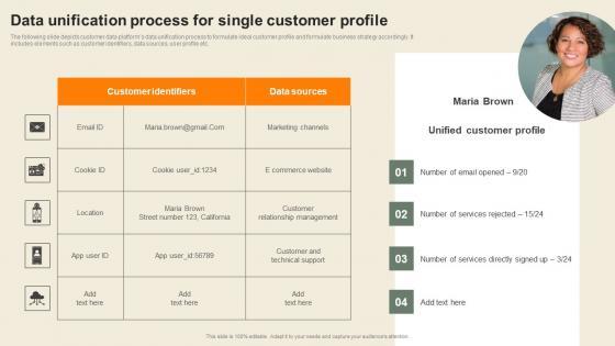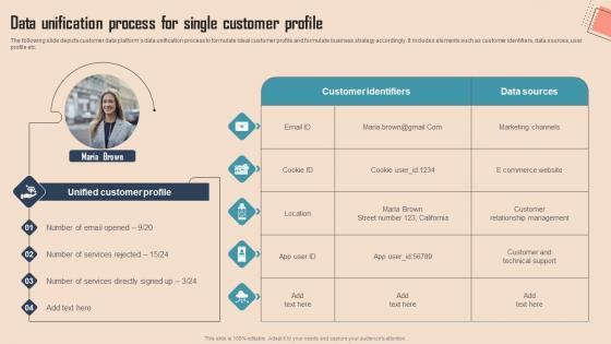 The following slide depicts customer data platforms data unification process to formulate ideal customer profile and formulate business strategy accordingly. It includes elements such as customer identifiers, data sources, user profile etc.Whether you have daily or monthly meetings, a brilliant presentation is necessary. Data Unification Process For Single Comprehensive CDP Guide For Promoters Rules Pdf can be your best option for delivering a presentation. Represent everything in detail using Data Unification Process For Single Comprehensive CDP Guide For Promoters Rules Pdf and make yourself stand out in meetings. The template is versatile and follows a structure that will cater to your requirements. All the templates prepared by Slidegeeks are easy to download and edit. Our research experts have taken care of the corporate themes as well. So, give it a try and see the results. The following slide depicts customer data platforms data unification process to formulate ideal customer profile and formulate business strategy accordingly. It includes elements such as customer identifiers, data sources, user profile etc.
