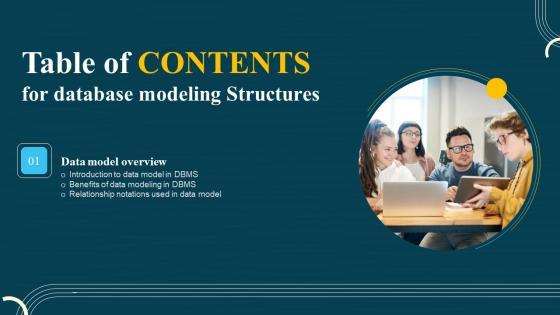 Retrieve professionally designed Table Of Contents For Database Modeling Structures Designs Pdf to effectively convey your message and captivate your listeners. Save time by selecting pre-made slideshows that are appropriate for various topics, from business to educational purposes. These themes come in many different styles, from creative to corporate, and all of them are easily adjustable and can be edited quickly. Access them as PowerPoint templates or as Google Slides themes. You do not have to go on a hunt for the perfect presentation because Slidegeeks got you covered from everywhere. Our Table Of Contents For Database Modeling Structures Designs Pdf are topically designed to provide an attractive backdrop to any subject. Use them to look like a presentation pro.