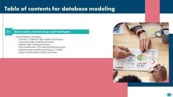 The Table Of Contents For Database Modeling Themes Pdf is a compilation of the most recent design trends as a series of slides. It is suitable for any subject or industry presentation, containing attractive visuals and photo spots for businesses to clearly express their messages. This template contains a variety of slides for the user to input data, such as structures to contrast two elements, bullet points, and slides for written information. Slidegeeks is prepared to create an impression. Our Table Of Contents For Database Modeling Themes Pdf are topically designed to provide an attractive backdrop to any subject. Use them to look like a presentation pro.
