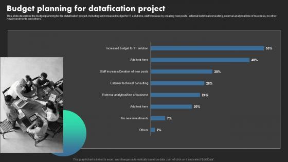 This slide describes the budget planning for the datafication project, including an increased budget for IT solutions, staff increase by creating new posts, external technical consulting, external analytical line of business, no other new investments and others. There are so many reasons you need a Improve Productivity, Facilitate Digital Transformation, Manage Data. The first reason is you cant spend time making everything from scratch, Thus, Slidegeeks has made presentation templates for you too. You can easily download these templates from our website easily.
