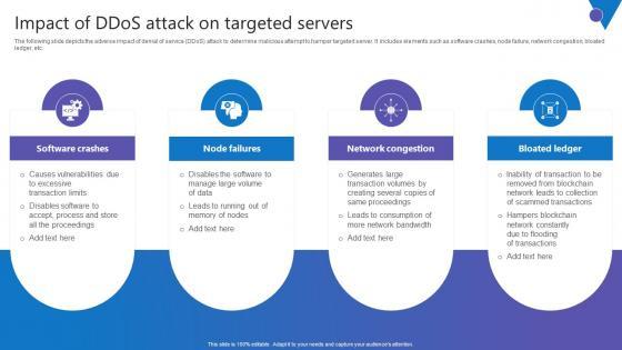The following slide depicts the adverse impact of denial of service DDoS attack to determine malicious attempt to hamper targeted server. It includes elements such as software crashes, node failure, network congestion, bloated ledger, etc. Slidegeeks is here to make your presentations a breeze with Impact Of DDoS Attack Comprehensive Guide To Blockchain Digital Security Sample Pdf With our easy to use and customizable templates, you can focus on delivering your ideas rather than worrying about formatting. With a variety of designs to choose from, you are sure to find one that suits your needs. And with animations and unique photos, illustrations, and fonts, you can make your presentation pop. So whether you are giving a sales pitch or presenting to the board, make sure to check out Slidegeeks first The following slide depicts the adverse impact of denial of service DDoS attack to determine malicious attempt to hamper targeted server. It includes elements such as software crashes, node failure, network congestion, bloated ledger, etc.