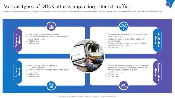 The following slide showcases various types of denial of service DDoS attack to reduce abnormal traffic and lessen the impact. It includes elements such as volumetric, applications, protocol, fragmentation attacks, etc. Get a simple yet stunning designed Various Types Of DDoS Attacks Comprehensive Guide To Blockchain Digital Security Introduction Pdf. It is the best one to establish the tone in your meetings. It is an excellent way to make your presentations highly effective. So, download this PPT today from Slidegeeks and see the positive impacts. Our easy to edit Various Types Of DDoS Attacks Comprehensive Guide To Blockchain Digital Security Introduction Pdf can be your go to option for all upcoming conferences and meetings. So, what are you waiting for Grab this template today. The following slide showcases various types of denial of service DDoS attack to reduce abnormal traffic and lessen the impact. It includes elements such as volumetric, applications, protocol, fragmentation attacks, etc.