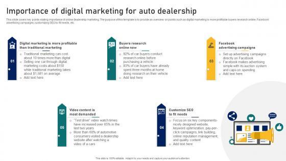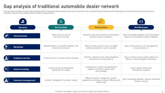 This covers flaws of traditional automobile dealership network. The purpose of this template is to provide an overview on the current and desired state along with identified gaps. It includes services such as sales process, marketing, customer service, dealers training, inventory management, etc. Find highly impressive Ultimate Guide To Developing Gap Analysis Of Traditional Automobile Dealer Network Strategy SS V on Slidegeeks to deliver a meaningful presentation. You can save an ample amount of time using these presentation templates. No need to worry to prepare everything from scratch because Slidegeeks experts have already done a huge research and work for you. You need to download Ultimate Guide To Developing Gap Analysis Of Traditional Automobile Dealer Network Strategy SS V for your upcoming presentation. All the presentation templates are 100 percent editable and you can change the color and personalize the content accordingly. Download now This covers flaws of traditional automobile dealership network. The purpose of this template is to provide an overview on the current and desired state along with identified gaps. It includes services such as sales process, marketing, customer service, dealers training, inventory management, etc.